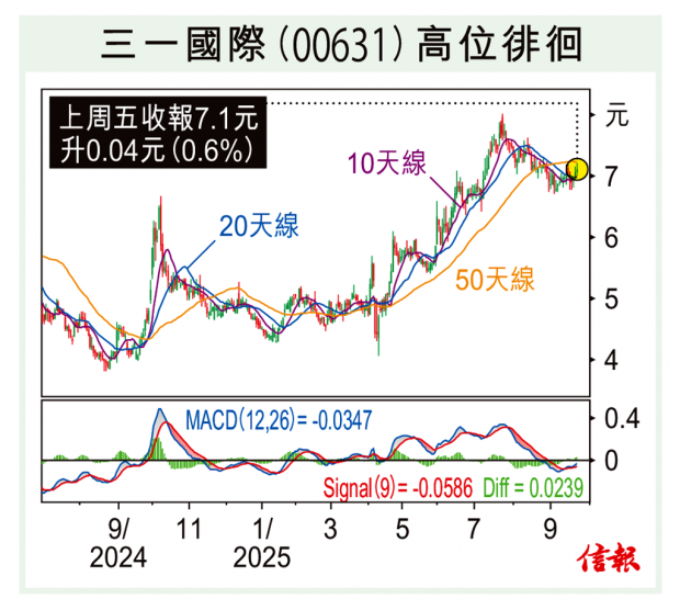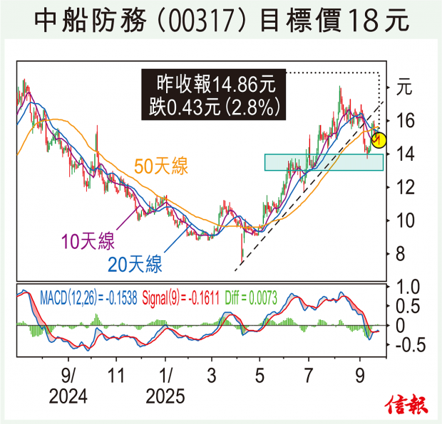 恒指連跌3日,昨收報26344,下挫200點,10天線(26384點)失守,20天線(25860點)受考驗。大市正處於短線調整階段,中長期仍然看好。 被視為軍工股的中船防務(00317),在九三閱兵前炒高至18.1元,閱兵當日「好消息出貨」以大陰燭下跌,跌至13.69元見支持。本...全文