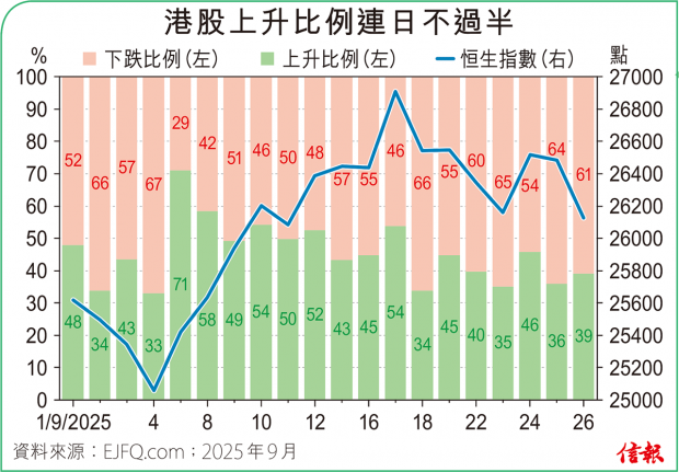 今年最大颱風樺加沙吹襲,港股上周連續兩個交易日「打風不停市」,市場觀望氣氛偏濃,恒指全星期在26000點水平拉鋸,上周五(26日)收報26128點,按周下跌417點(1.57%)。88隻藍籌有79隻見紅,61隻跑輸大市。...全文