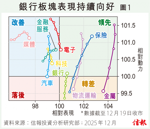 根據以恒指為基準的EJFQ行業分類日線輪動圖顯示,截至11月17日收市,銀行板塊的相對動力已連升7個交易日,留意短期能否有望移入領先方格。該板塊目前以匯豐控股(00005)、渣打集團(02888)和恒生銀行(00011)勢頭較強。...全文