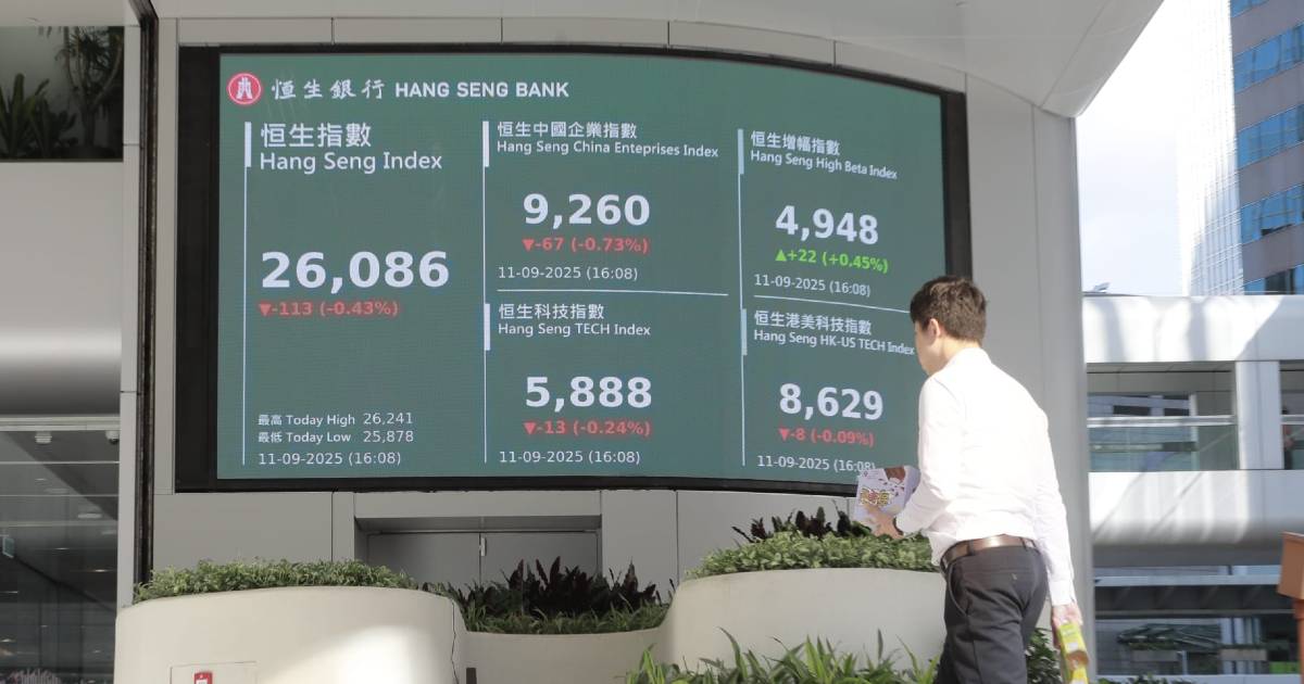恒指低開212點或0.8%,報25987點後,跌幅隨即最多擴大至321點,低見25878後有買盤承接,科技股回穩,大市逐步收復失地,一度倒升41點,高見26241,惟未能持續,全日最終跌113點或0.43%,報26086。