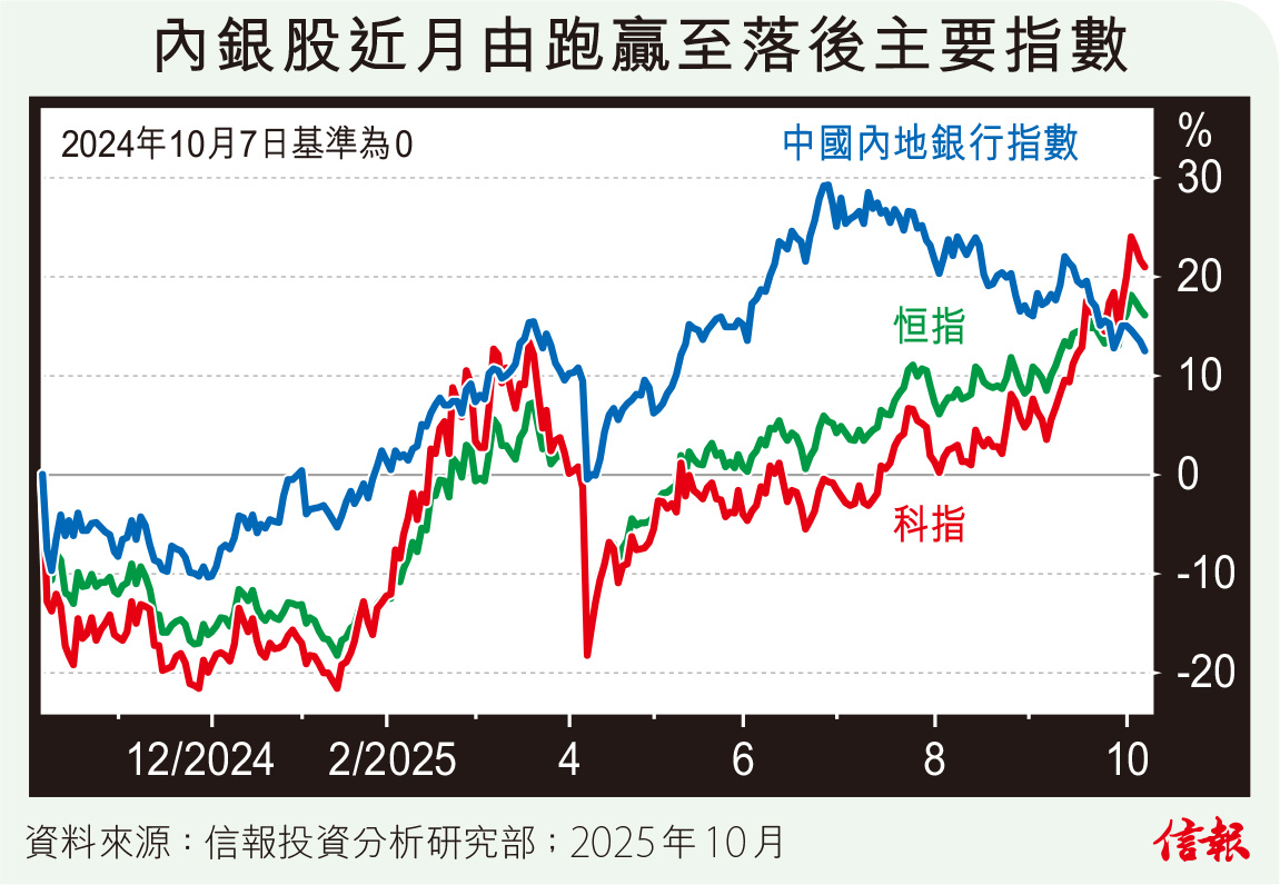 科網股重估遠未結束,另一個板塊則完成了一趟估值周期波動。附【圖】所見,去年組合拳高峰期至今一直跑贏的恒生中國內地銀行指數,於今年6月尾觸頂掉頭下行,9月底開始更被屢刷多年新高的恒指和科指後來居上;內銀股指數從峰值挫近13%,足證這3個月承受沉重沽壓。